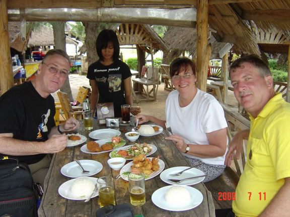 Hua Hin Reunion, July 2008/01.jpgPrevious | Home | NextJoe Wright, a waitress, Mary Jo Wright and Bob Dobias at a little seafood ran-ahan somewhere between Hua Hin and Khao Samroi Yod National Park on the coast in Prajuabkirikhan, Thailand, July 2008 (Aroy dee!) |
